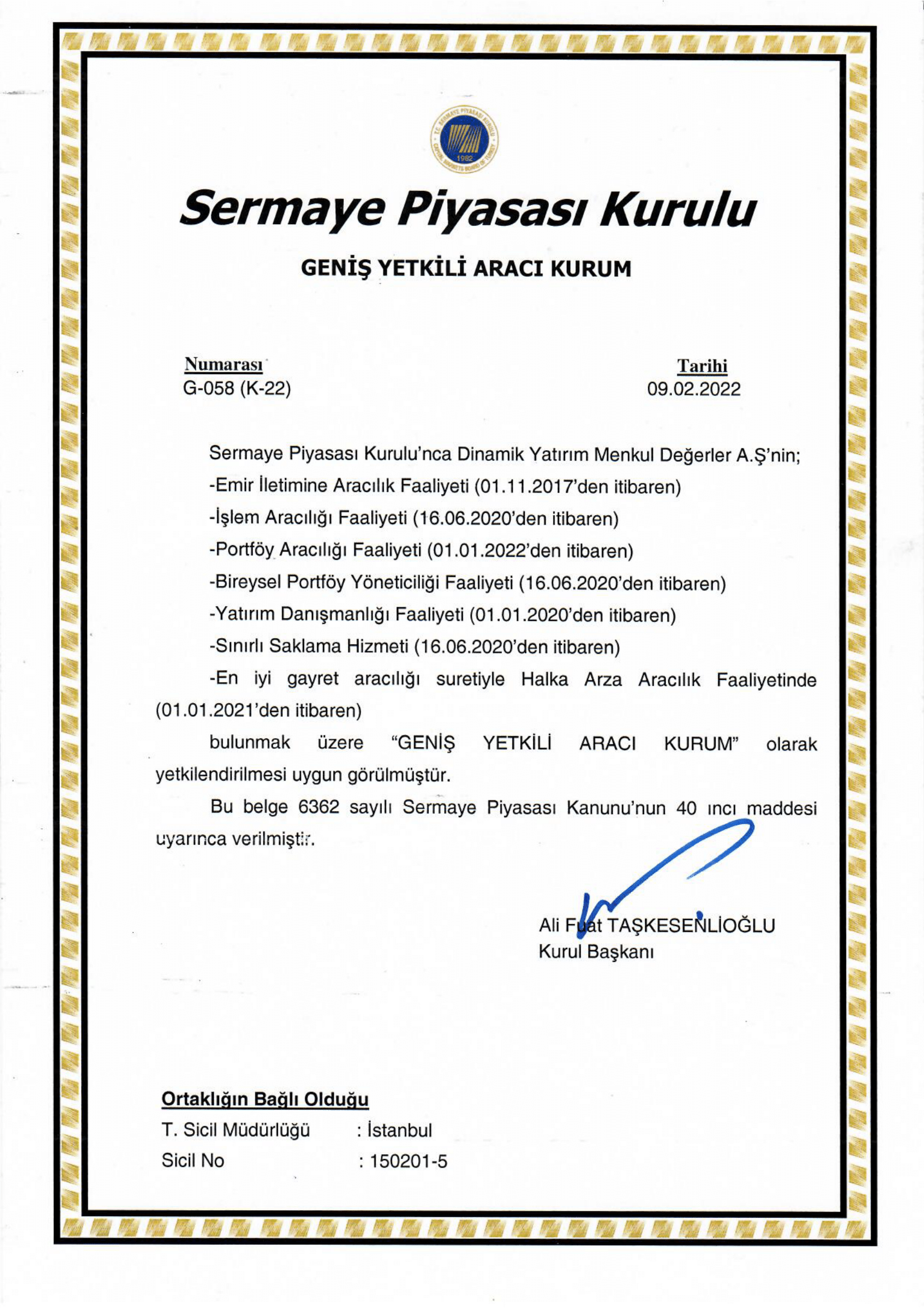 Sermaye Piyasayı Kurulu’nca Dinamik Yatırım Menkul Değerler A.Ş.’nin 09.02.2022 tarihli G-058 numaralı lisans ile Emir İletimine Aracılık Faaliyeti, İşlem Aracılığı Faaliyeti, Bireysel Portföy Yöneticiliği Faaliyeti, Portföy Aracılığı Faaliyeti, Yatırım Danışmanlığı Faaliyeti ve Sınırlı Saklama Hizmetinde bulunmak üzere “GENİŞ YETKİLİ ARACI KURUM” olarak yetkilendirilmesi uygun görülmüştür.